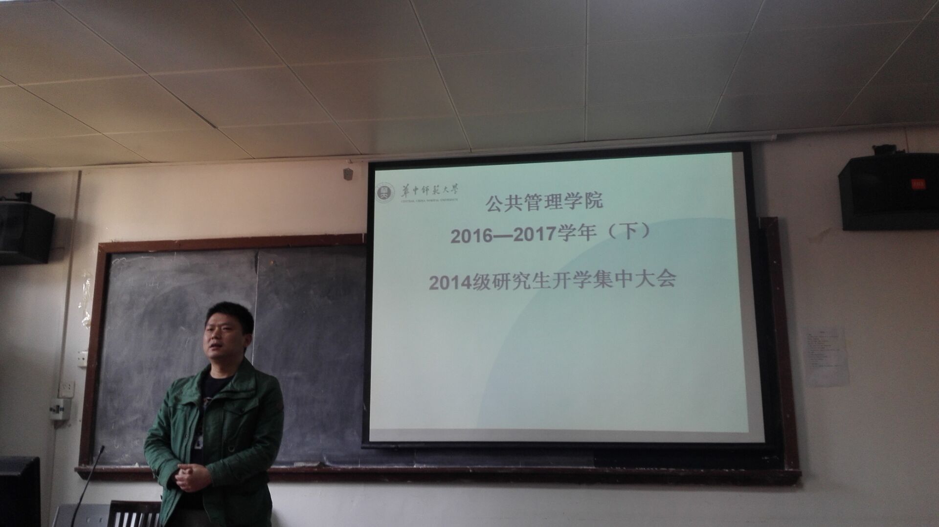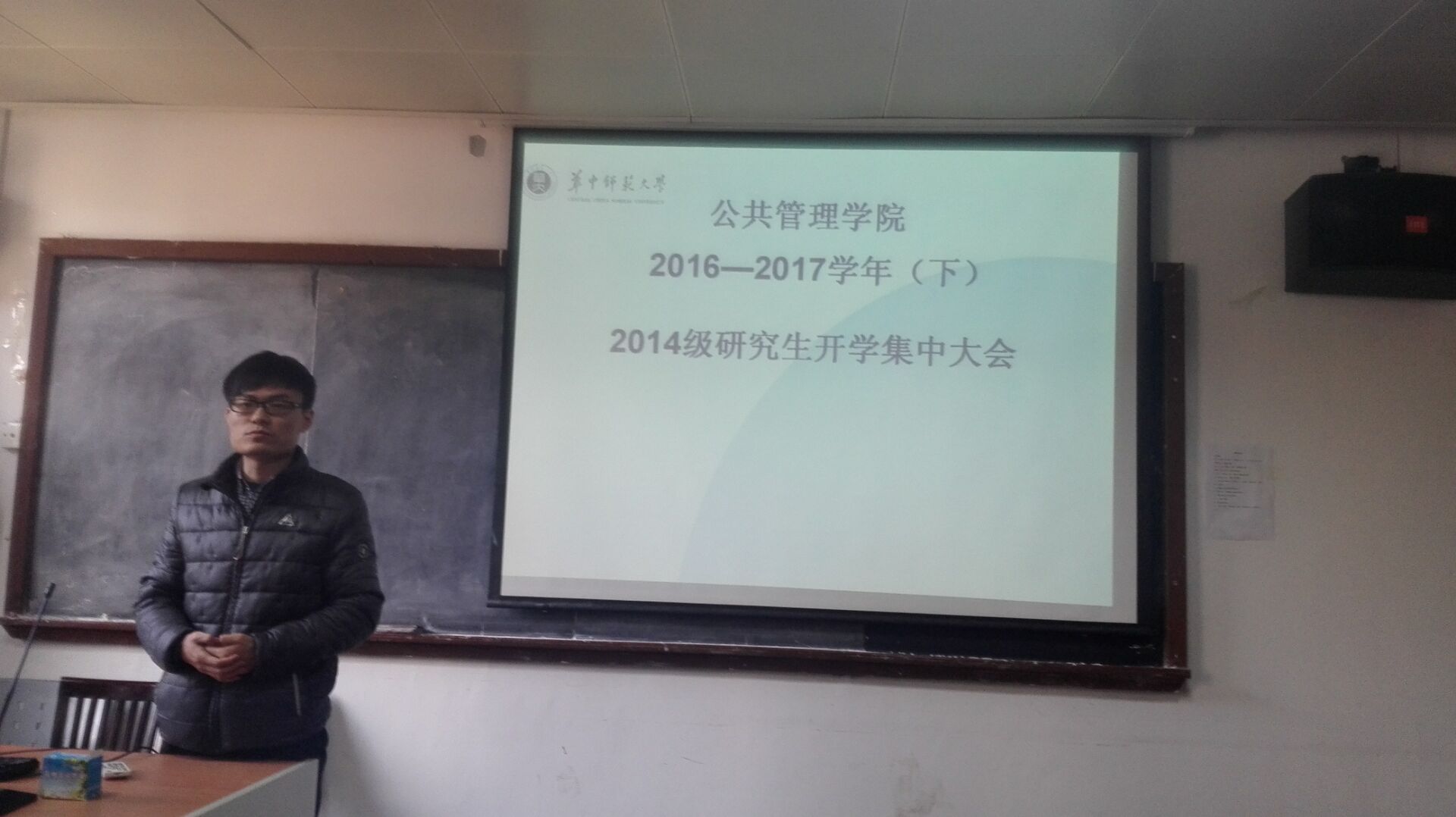 银娱GEG优越会研究生讯(通讯员:岳翠朋)2017年2月13日下午4点,2014级研究生新学期开学集中大会在管院319教室顺利举行,学院研究生辅导员魏寅老师,研究生教书秘书欧阳老师以及研究生兼职辅导员童志阳出席了大会,大会由14级年级研会主席岳翠朋主持。