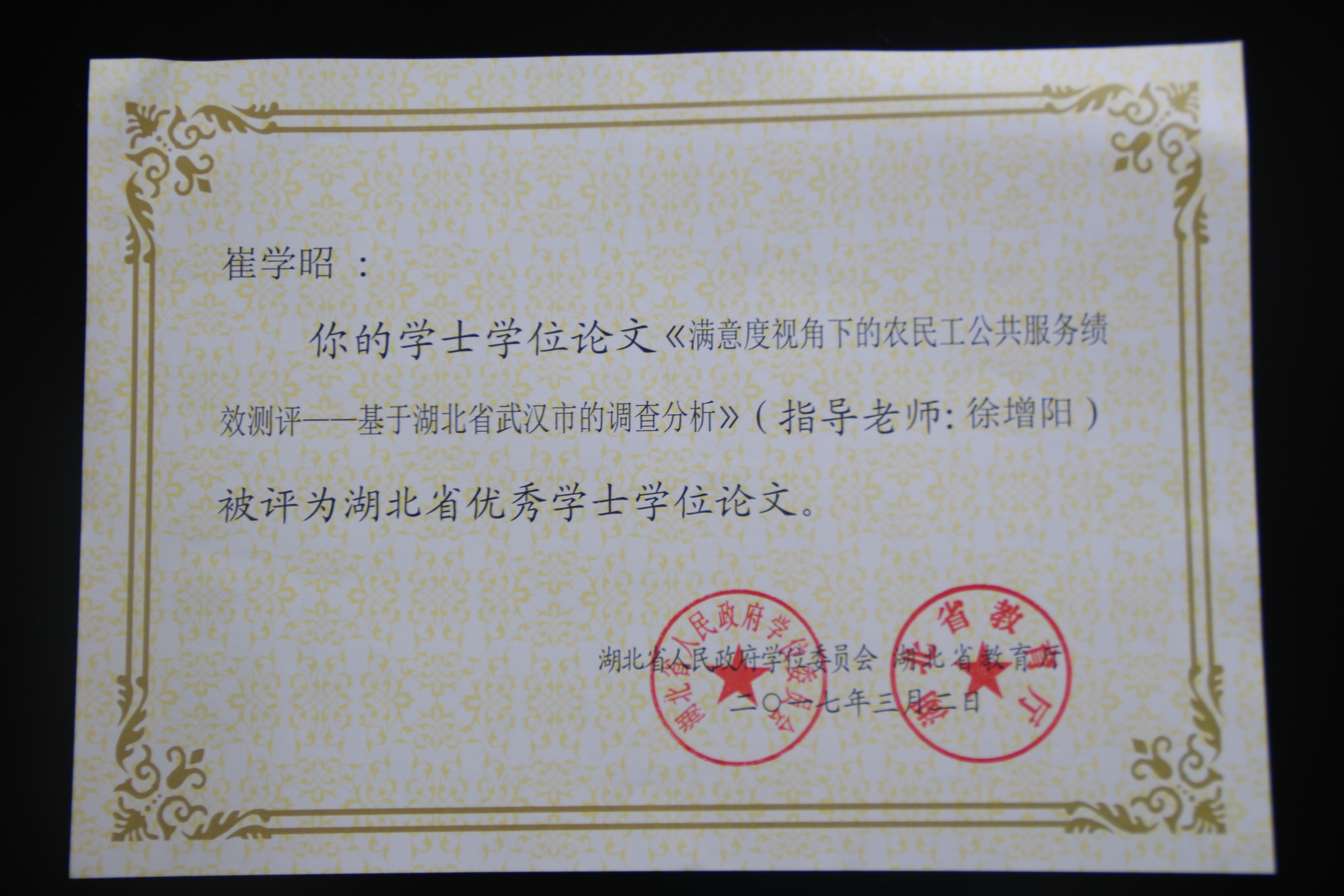 (通讯员:余嫏)近日,湖北省人民政府学位委员会、湖北省教育厅联合发文公布了2016年湖北省优秀学位论文评选结果。我院行政管理专业2012级本科生崔学昭的毕业论文《满意度视角下的农民工公共服务绩效测评——基于湖北省武汉市的调查分析》被评为湖北省优秀学士学位论文。论文指导教师为徐增阳副院长。