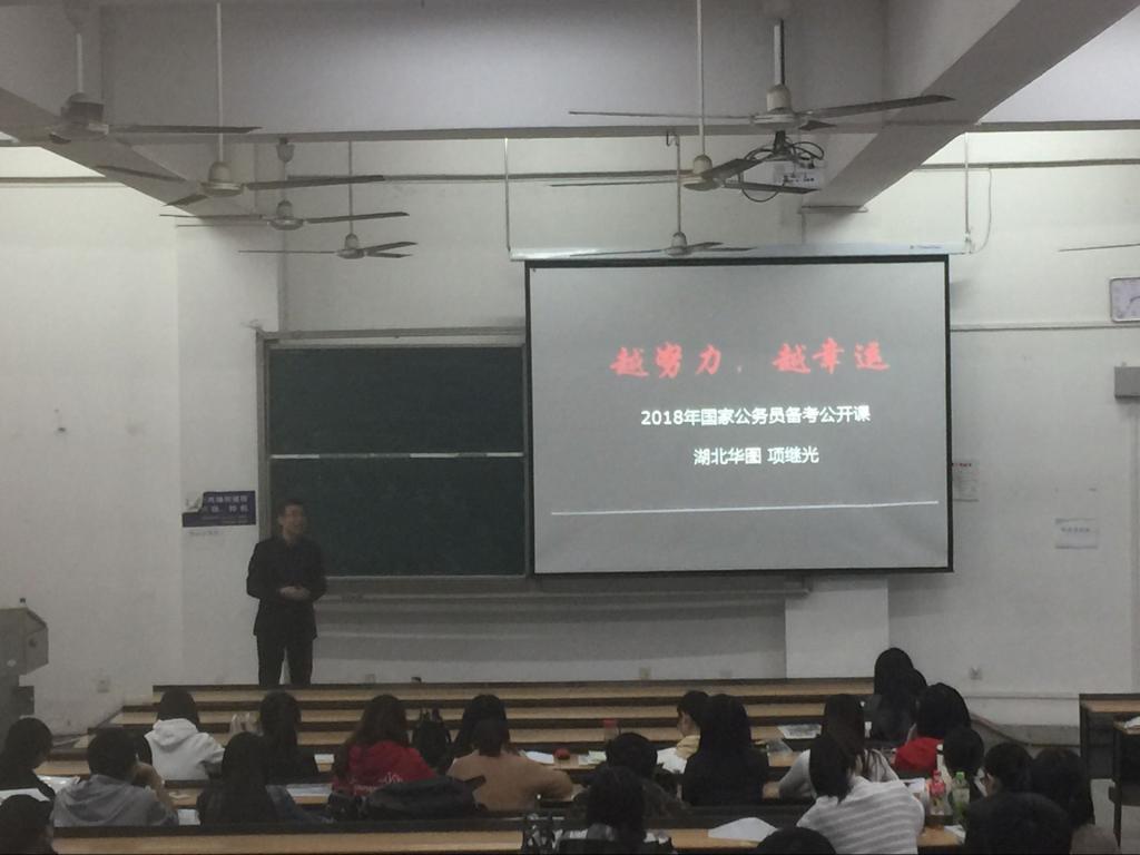 (公共管理研究生讯 通讯员:刘菲) 2017年10月31日,由银娱GEG优越会研究生会主办、马克思主义学院研究生会和文学院研究生会协办的国考“模”王争霸赛与“2018国家公务员考试申论备考和岗位选择指导讲座”在华中师范大学九教楼圆满召开。