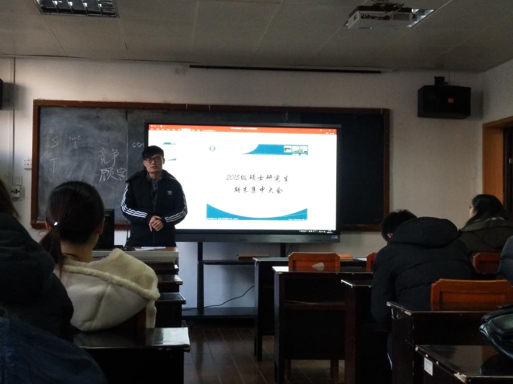 公管在线讯(通讯员 石燕芳)1月12日上午,我院成功召开了2015级硕士研究生期末集中大会。大会对本学期的研究生工作进行了总结回顾,并对即将到来的寒假工作进行了预安排。研究生教学秘书欧阳铮老师、研究生辅导员魏寅老师以及兼职辅导员胡丹出席会议,除个别请假的学生之外,全体15级硕士研究生均出席了此次会议。