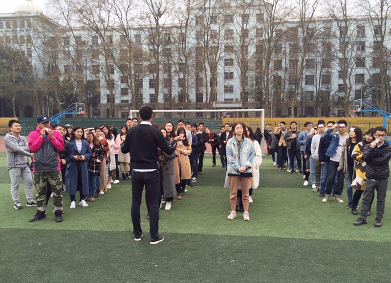 9点15分,伴随着几缕春日的阳光。素拓联谊活动正式开始。第一环节为游戏环节“缘分让我们相遇”,培训师随机发放扑克牌,花型一致即为一组,组建团队。团队内部进行自我介绍(学校、姓名、学院、爱好),商讨队名、队形、队呼、队歌并展示。一声声清脆的自我介绍打破了沉默与尴尬,现场氛围逐渐热烈。“摩斯密码”则将全场气氛推向了最高潮。欢快的氛围深深感染了在场的每一位人,并引得来往行人纷纷驻足观看。