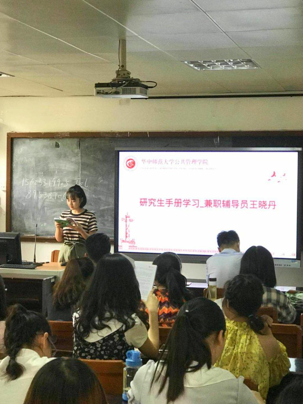 兼职辅导员王晓丹详细讲解了研究生手册的各项管理制度,熊雪婷、贺雯和吴慧云3位同学对校情院情进行介绍,让同学们对研究生的生活有了更深的理解。