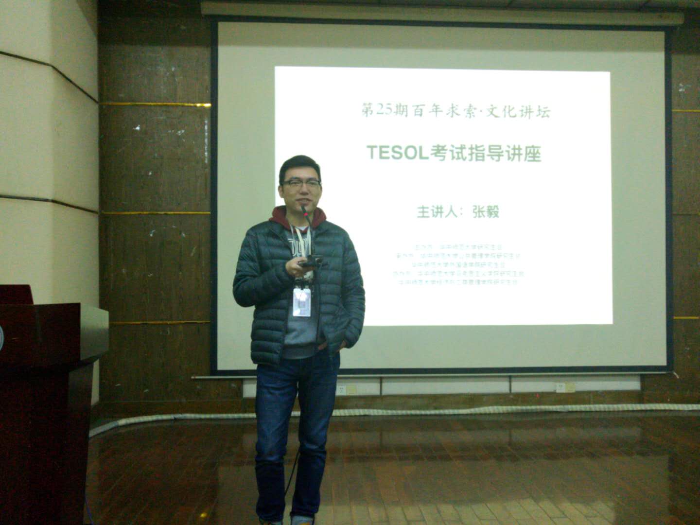 公管在线讯(通讯员 袁梦雯 摄影 王彤)2018年11月21日晚18:30,由华中师范大学研究生会主办、银娱GEG优越会研究生会、外国语学院研究生会承办、马克思主义学院研究生会、经济与工商管理学院研究生会协办的第25期“百年求索·文化讲坛”在我校九号楼报告厅举行。美国考试委员会受聘TESOL培训师、全国公共英语考官、中央电视台风采英语比赛评委张毅老师受邀为我校学生举办了一场TESOL考试指导讲座。