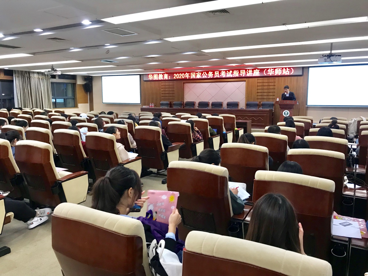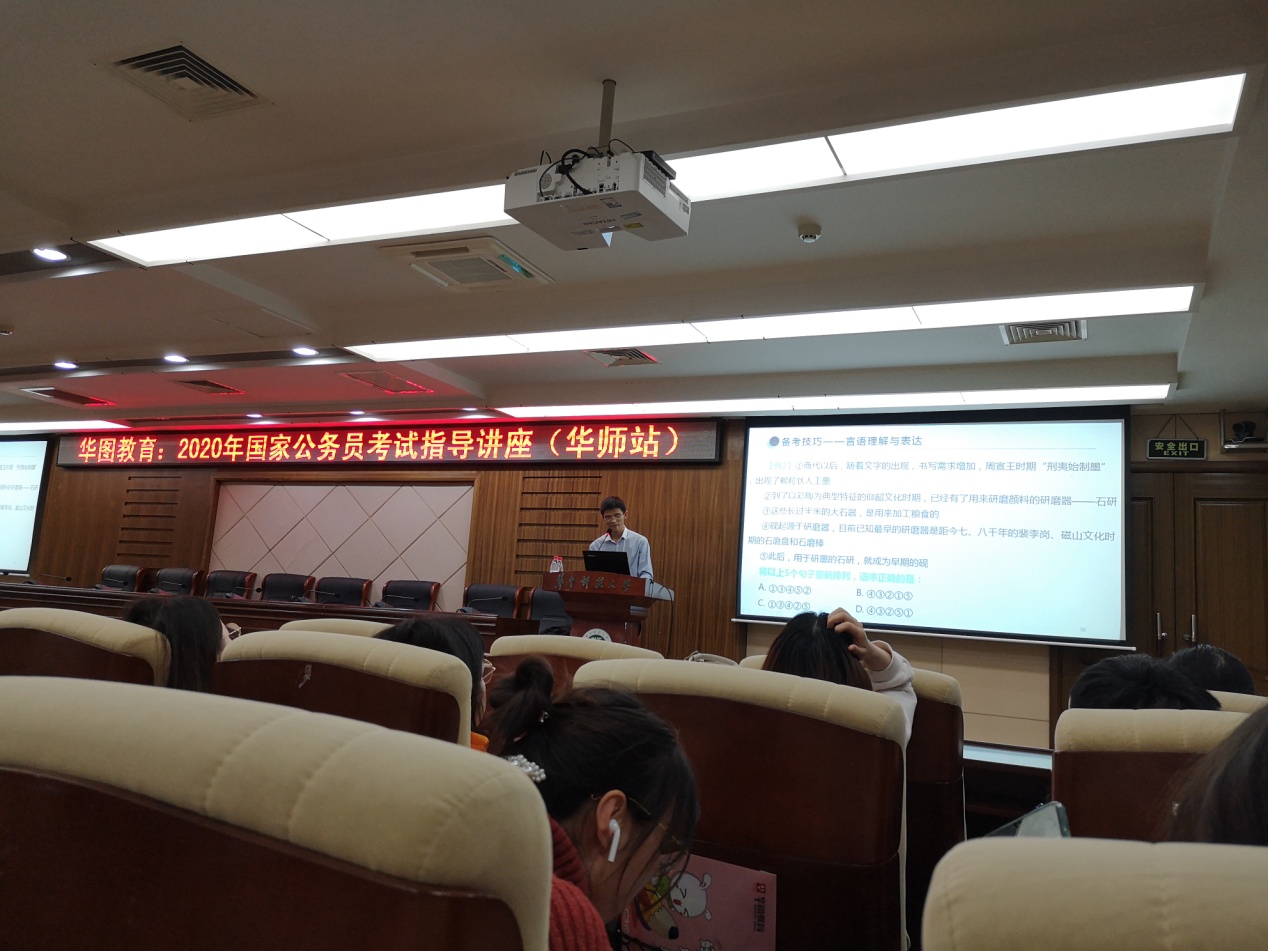 本次讲座邀请湖北华图教育的熊科老师授讲,讲座开始之前,同学们有序签到并依次领取赠送资料入场就座。讲座之初,熊科老师给同学们强调了国考、省考、选调生考试、事业单位考试以及其它类公职考试的考试时间点。