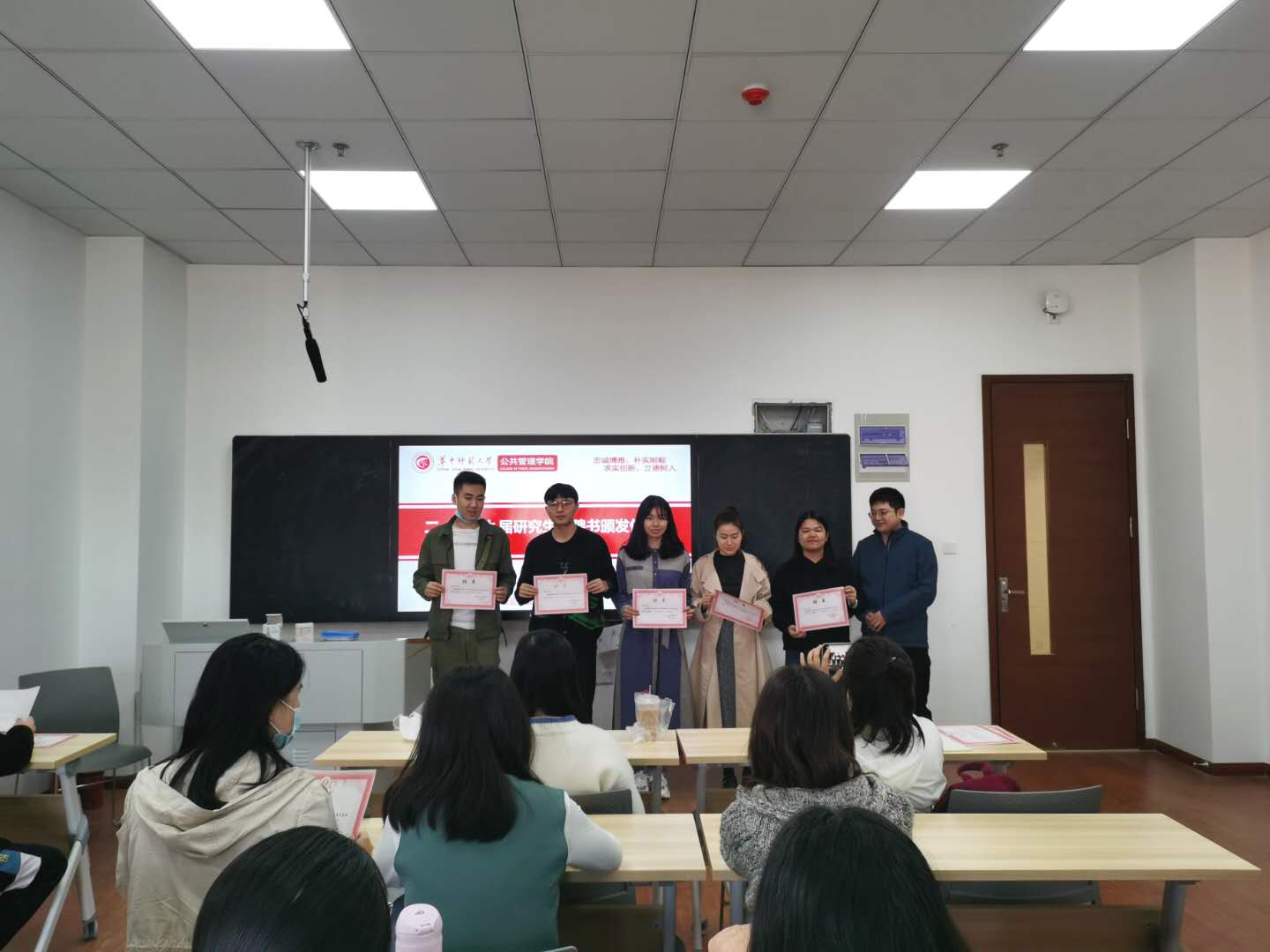 接着,举行了研究生会聘书颁发仪式。由廖伟老师为团总支、主席团、各部门成员颁发聘书,并对新一届的研会提出了殷切期望,他希望研会成员在未来的工作中能恪尽职守、尽职尽责,认真完成部门工作的同时,更好地为学院老师和同学服务。