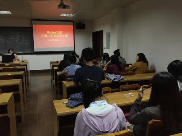 为深入开展“两学一做”学习教育,我院15级研究生各支部组织开展“学党章、学党史知识”竞赛活动。5月25日晚,研1501支部在我院419教室举行知识竞赛活动掀开了系列理论知识竞赛活动的序幕。活动由研1501支部书记李丽莎主持。