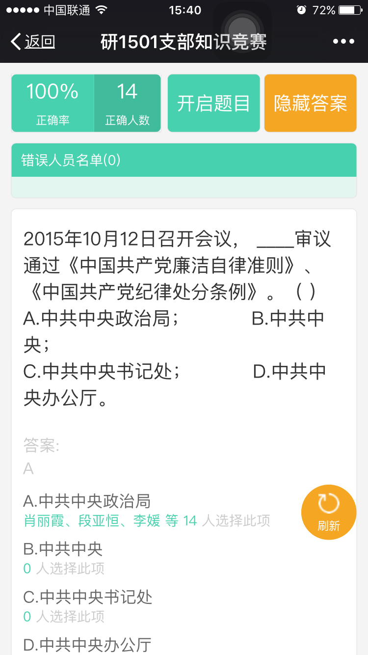 为避免传统形式的单一乏味,增强竞赛活动的灵活性、实效性和趣味性,本次竞赛借助我校牵头研发的“微助教”网络课堂互动平台,直接在线答题,题目类型包括选择题和填空题,以抢答形式进行。参赛成员只需借助手机,即可完成网络竞赛课堂签到,同时进入该课堂等待答题。知识竞赛的内容主要包括党章、《廉洁自律准则》和《纪律处分条例》等党规和党史的部分基础知识,题量适中,难度系数中等。