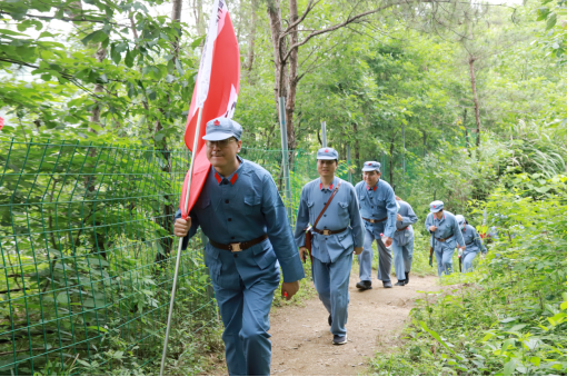 行军途中再现战场实况,讲解员讲述红25军历史和故事。师生们唱起红军歌曲,参与“争当红旗手”等活动,聆听血战独树镇、庾家河生死战历史故事,体验袁家沟战场,感悟红军战士冲锋在前、不畏牺牲的革命精神。行军道路崎岖险阻,红军精神代代相传,创一方安宁之所,保万家安居乐业。