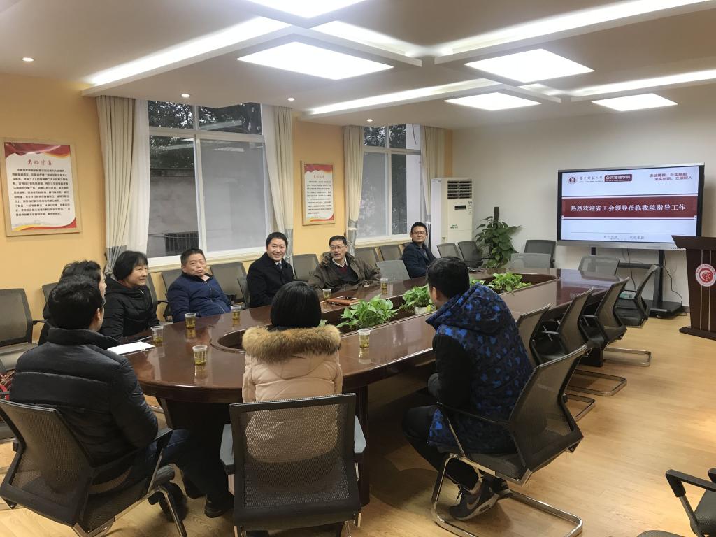 公管在线讯(通讯员 魏寅 朱淑娟)1月24日上午10点,湖北省教育工会主席李斌在校工会主席周东明和校工会常务副主席郭春娥等的陪同下,莅临我院慰问湖北省五一劳动奖章获得者戴胜利副院长并指导我院工会工作,我院党委副书记曾艳、工会主席费军参加了接待。
