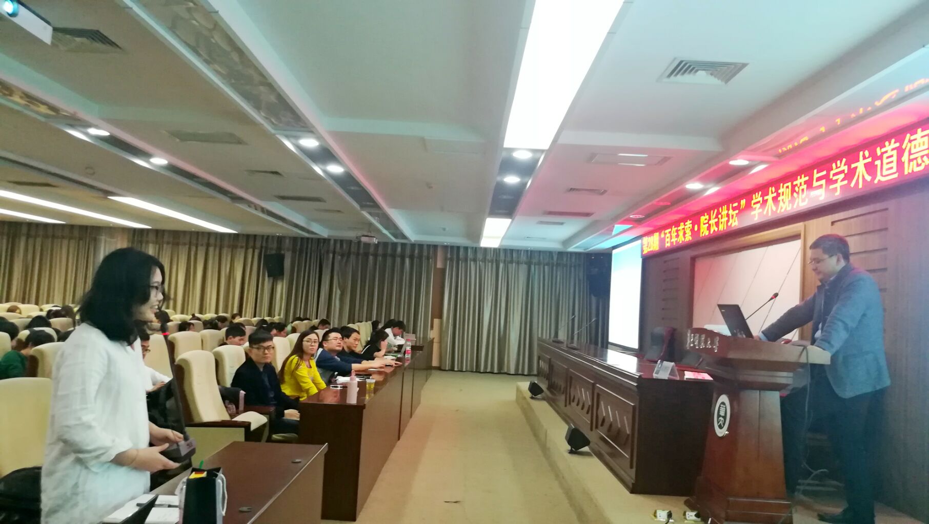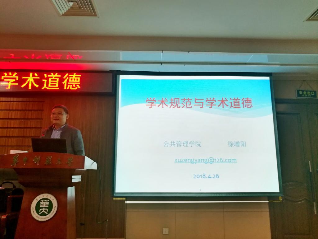 公管在线讯(通讯员:袁迎辉)4月26日晚7点,我院副院长徐增阳教授应邀做客“百年求索院长讲坛”作了题为“学术规范与学术道德”的专题讲座。本次讲座由我院2017级研会主席王晓丹主持,我院辅导员魏寅老师和全校学子参加了讲座。