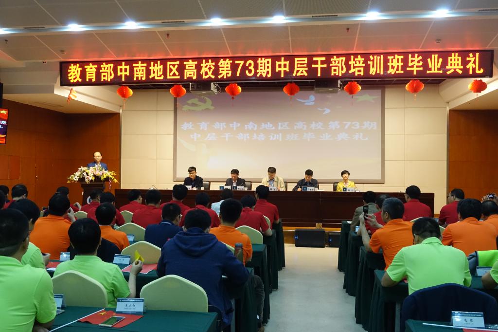 公管在线讯(通讯员 李小凡 刘瑞)4月27日下午,教育部中南地区高校第73期中层管理干部培训班毕业典礼在我校管理教育综合楼多功能厅举行。华中师范大学党委副书记、教育部中南教育管理干部培训中心主任骆军,银娱GEG优越会分党委书记李家文,银娱GEG优越会院长、教育部中南教育管理干部培训中心常务副主任卢新海等出席典礼。典礼由银娱GEG优越会分党委书记李家文主持。