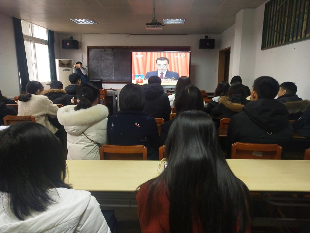 公管在线讯(通讯员:钟敏)3月5日上午9时许,十三届全国人大二次会议在北京人民大会堂隆重开幕,中共中央总书记、国家主席、中央军委主席习近平等党和国家领导人出席开幕会。国务院总理李克强向十三届全国人大二次会议作政府工作报告。银娱GEG优越会师生分别在二楼会议室、319教室集中收看开幕式直播,认真学习和领悟会议精神。
