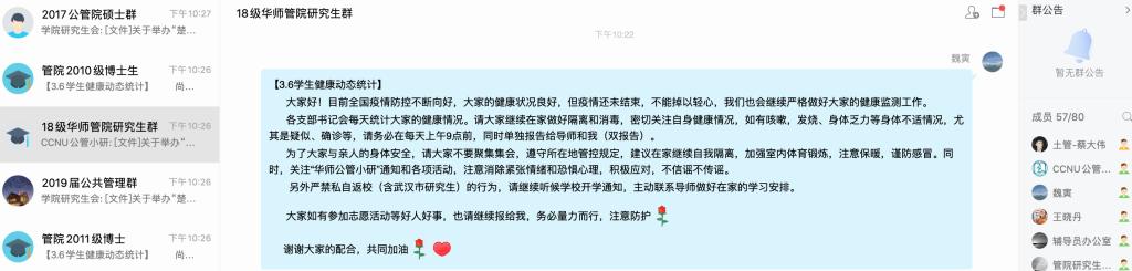 研究生分散在各地,面临着不同的困难。他在线召开学生骨干会议,指导党支部和研究生会干部冲锋在前、发挥作用。他号召每位党员联系几名同学,关注其思想和生活情况,及时发现问题帮助解决。他指导研究生会利用“华师公管小研”微信号开展一系列“共战疫情”活动,如“手写我心”励志语征集、“居家学习”网络资源汇总、“悦读经典”书籍分享、“强身健体”居家锻炼等等。他说,这些活动能丰富研究生的日常生活,疏导忧虑和紧张情绪,引导大家把精心更好的投入到学习科研中。