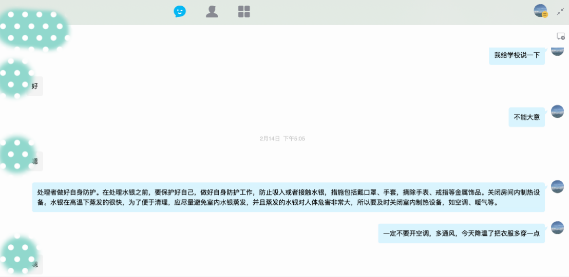 学院有两名研究生滞留学校,他主动联系帮助解决实际困难。研究生反馈宿舍网络有问题,他马上帮忙报修。研究生体温计摔破了,他立即多方咨询,指导学生正确处理,消除安全隐患。他的每天“唠叨”,给留校研究生消除了心中的不安。