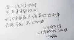 同学们在“云点名”中畅所欲言,交流了学习体会,以及疫情期间发生在身边的感动。闫铭轩同学说,“作为一名公管学子,应该时刻抱有“善政天下,良治中国”的信仰与初心。牢记使命在身,责任在前,疫情面前不退缩,困难面前不止步。我虽然不能前往武汉参战,但仍然希望能够贡献自己的一份力量,守好我的责任田,我想,这才是属于中国青年的色彩与担当。”刘从理同学的父亲是一名医生,在新建的方舱医院需要人手、需要支援的时候,作为党员的父亲毅然走到一线。“知道父亲要到一线去的时候,我红着眼,噙着泪水,克制着自己的情绪,鼓励父亲,作为党员,作为医生他要义无反顾,作为孩子,我要他健康归来。因为,我只有一个父亲。”刘从理谈到父亲奋战一线时激动的说。最后同学们以书写的方式为武汉加油。