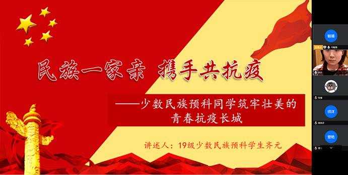 民族一家亲,携手共抗疫,2019级预科班、校恽代英青年讲师团成员齐元从志愿服务展担当、勤奋学习练本领、汲取力量永奋斗三个方面讲述了少数民族预科同学的青春战疫故事。她最后用一段青春誓言激励自己和所有预科学生,传承和发扬五四精神,用青春拥抱时代,以拼搏创造未来,只争朝夕,不负韶华,让青春绽放绚丽之花,再华师奏响奋进的乐章。 院党委副书记曾艳在点评中肯定了预科同学们用真挚热诚的情感、志愿奉献的行动和刻苦学习的态度参加战‘疫’的突出表现,希望同学们将战疫中的收获转化为成长成才动力,更加努力地习得真本领,用奋斗书写青春华章。