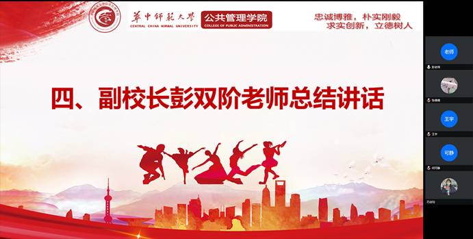 副校长彭双阶在总结讲话中点赞三位故事讲述学生,指出他们用实际行动践行着“忠诚博雅、朴实刚毅”的华师精神,在这次突如其来的战疫中,以积极的心态、快速的应变、勇敢的担当交出了一份满意的答卷。他希望青年学生们要热爱祖国、热爱人民,要把自己的理想同祖国的前途、把自己的人生同民族的命运紧密联系在一起,扎根人民,奉献国家;要尊重生命、珍惜生命,树立正确的人生观、价值观,延长生命的长度,增加生命的厚度,实现人生价值;要崇尚科学、坚持真理,努力求知,增长才干,担负起中华民族伟大复兴的历史使命。他说,立志者,为学之心也;为学者,立志之事也,青年学生们要不忘初心,坚定理想,赓续”五四精神“,勇担时代的重任。