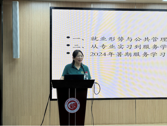 周凤华副院长做了题为《以服务学习之光照亮实习之路》的实习培训。她介绍了服务学习理念,强调在实习中不仅要深化理论知识,更要通过反思提升个人能力与公民素养,为实习单位做出贡献,实现多方共赢。她结合《服务学习日志》的填写,鼓励学生通过结构化反思,主动发现问题,深入开展研究,带着成果回归校园。