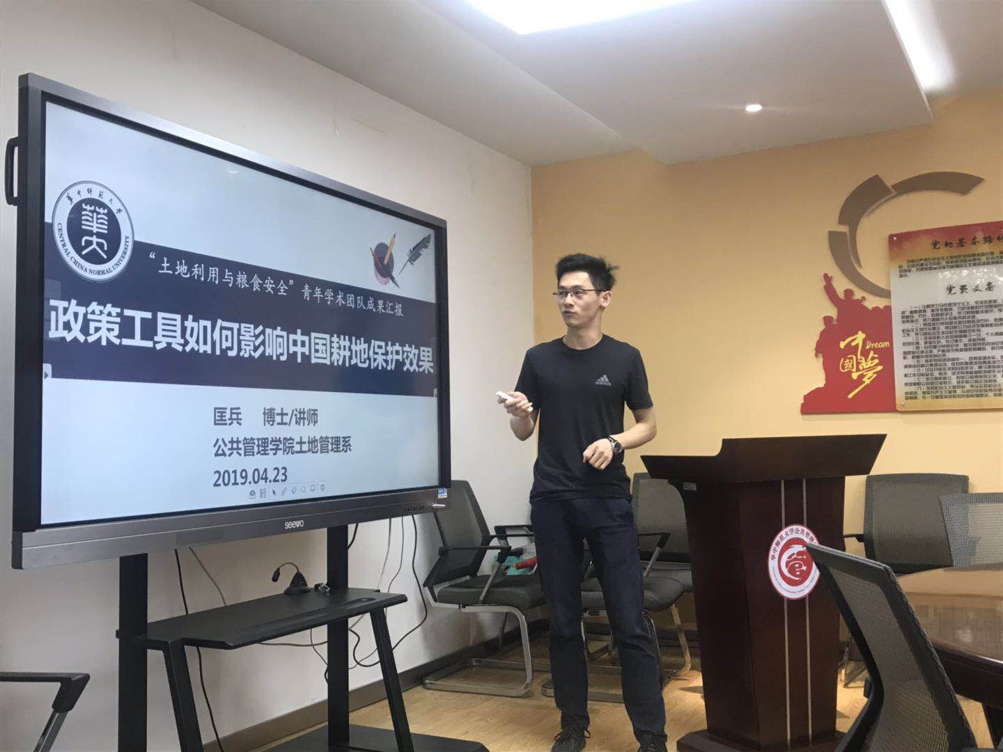 接下来,本次的主讲人匡兵老师就“政策工具如何影响中国耕地保护效果”这一主题来讲述自己的学术见解和研究结果。他表示“耕地保护政策本身和政策的执行力对于耕地保护的效果来说是同等重要的,在实现政策目标的过程中,不该只关注政策方案的完善,还应该关注政策工具的使用”。随后,匡兵老师从研究缘起、理论分析与研究假设、实证模型与数据来源、结果分析、结论与展望五个部分对论文进行了详细汇报。